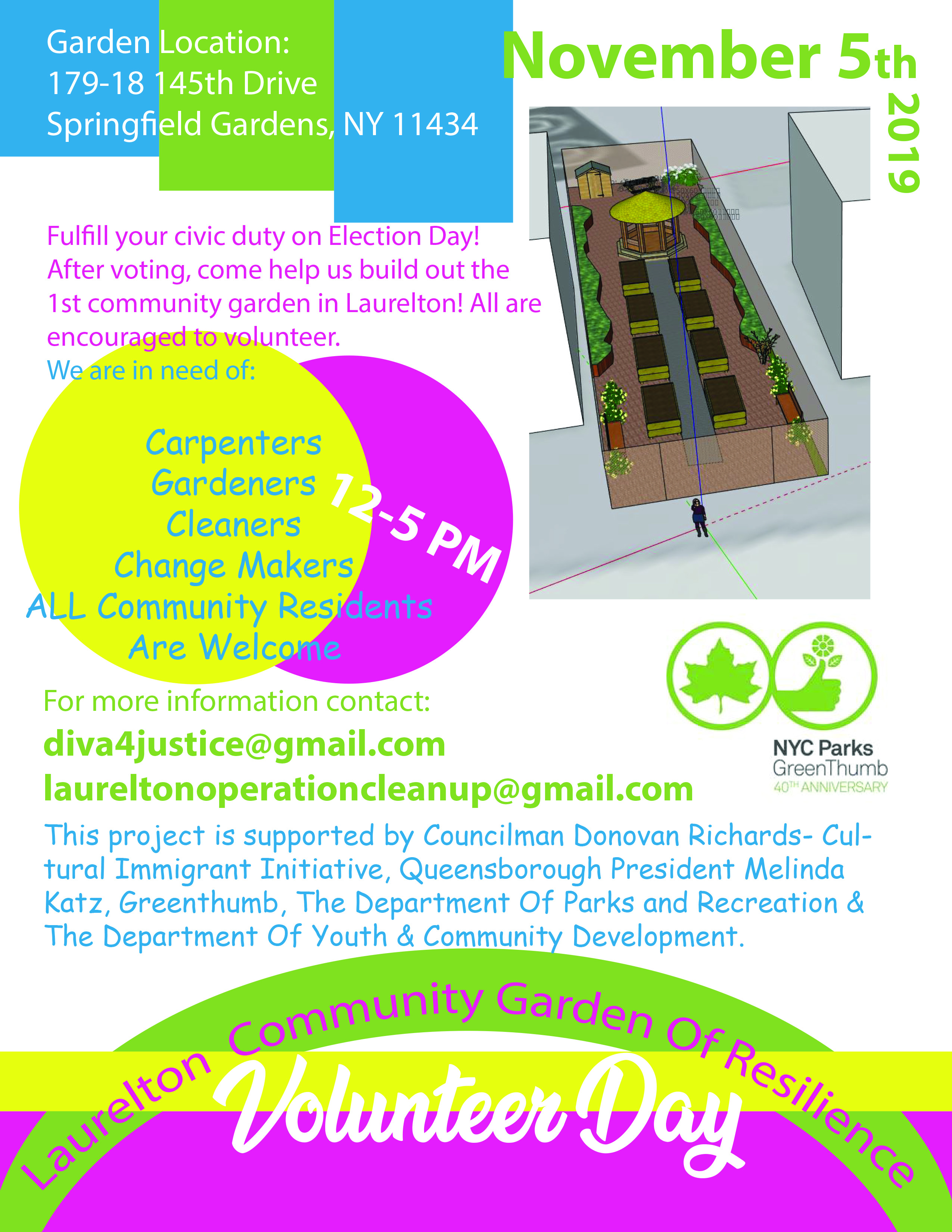 Join us in launching the 1st community garden in Laurelton. We need ALL residents involvement. The build out of the garden will be taking place from 12-5 PM on November 5, 2019. We look forward to seeing you there. If you have additional questions, please reach out to us at: