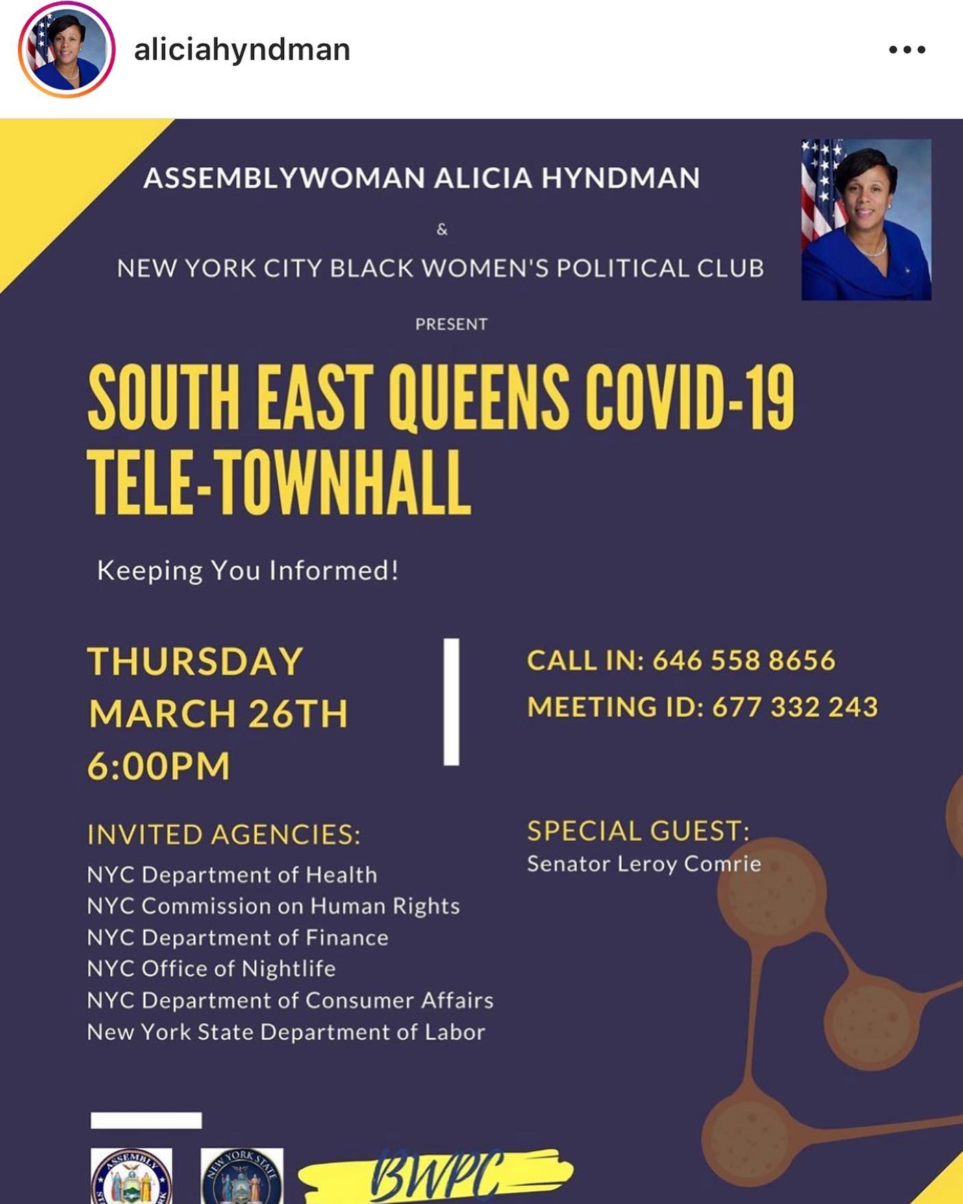 March 26, 2020, Assembly Woman Alicia Hyndman hosted the South East Queens COVID-19 Tele-Town Hall meeting to inform people of different agencies that they can receive help in this pandemic. Helping her host this conference was Senator Leroy Comrie.