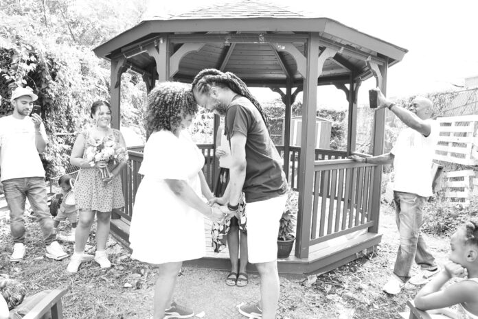 Garden Resilience hosted its very first wedding on August 19, 2023. Stacie Bruce, a local resident of Springfield Gardens visited the garden a few weeks back. Bruce was dropping off her compost and was taken by the beauty of resilience. Ms. Bruce recently became a wedding officiant of New York and was set to marry her friends, Melissa and David. The couple wore matching red pumas as a symbol of their bond and a wonderful ode to the 50th anniversary of hip hop. Youth volunteers of Garden Of Resilience worked to get the space wedding ready by creating a welcoming message on the chalkboard and planting additional flowers. We wish Melissa and David love always.