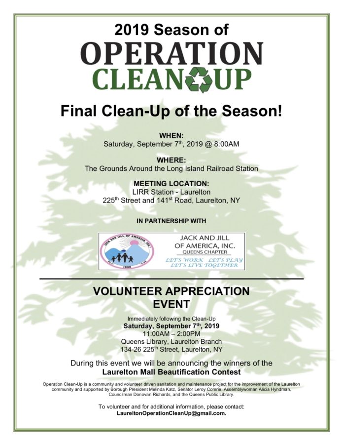 CommunityCivicVoices Final Clean Up Of The Season…… Don’t Miss It! By Clarisa James - August 29, 2019 0 1929 Facebook Twitter Pinterest WhatsApp WHEN: Saturday, September 7th, 2019 @ 8:00AM WHERE: The Grounds Around the Long Island Railroad Station MEETING LOCATION: LIRR Station – Laurelton 225th Street and 141st Road, Laurelton, NY