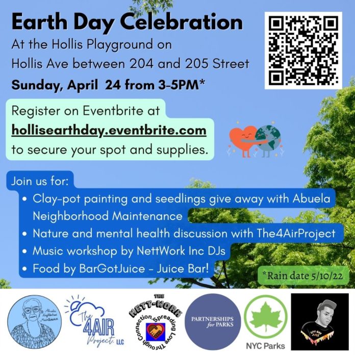 Southeast Queens is coming out strong with initiatives around a more and just community. You can do your part by volunteering at The Earth Day Celebration at Hollis Playground on April 24, 2022 from 3-5 PM. You can register for the event at: hollisearthday.eventbrite.com