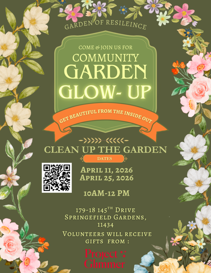 Currently, community gardens occupy over 100 acres of public open space across the five boroughs [1]. Community gardens are collaborative projects in which people maintain gardens, planting healthful, affordable, fresh fruits and vegetables for community members. It’s its own ecosystem of plants, soil, and sometimes native insects and animals. Volunteers help this ecosystem flourish by planting, watering plants, composting, and maintaining clean spaces. Birds can eat insects that may damage plants or eat fruit, spreading seeds which help plants reproduce. In return, by the end of spring into summer, we get a rich harvest of fresh produce from plants we can consume to make our diet a little healthier. There are also broader environmental impacts when cultivating a prosperous community garden. Research has shown that activities such as planting and gardening have been linked to reduced Urban heat island (UHI) temperatures and moderate positive effects on our general and mental health [2][3]. This spring and summer, community gardening would be a great way to spend your free time with your kids, friends, or others in your community. Your volunteering gives back to the community you live in by helping address issues such as food deserts, urban heat islands, and other environmental and social issues, and by providing a valuable service to you and the community. A perfect opportunity to get a taste as a volunteer is at The Garden of Resilience, a community garden based in southeast Queens, located at 179-24 145th Dr, Springfield. This April, give love back to the earth at The Garden of Resilience’s “Community Garden Glow-Up” event, where attendees will clean up the garden on April 11th and 25th from 10 am-12 pm. The efforts of our volunteers will be rewarded with beauty gifts from Project Glimmer.